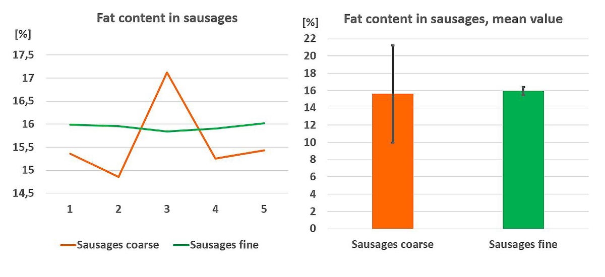 样品均质化可确保结果的可重复性。粗磨样品的标准偏差通常比彻底粉碎样品的标准偏差更大。从下面的例子中可以看出这一点: 通过微波诱导干燥结合核磁共振光谱法,连续五次分析了颗粒为 4-5 毫米的香肠样品和颗粒小于 0.5 毫米的均质样品的脂肪含量。每次测量在 2.5 分钟内烘干 4 克样品,并在 1 分钟内进行分析。粗香肠样品的脂肪含量比细香肠样品的脂肪含量变化更大。第一部分的脂肪含量在 14.85 % 到 17.12 % 之间,标准偏差为 0.88 %。在均质样品中,标准偏差降低了 10 多倍,仅为 0.07 %,脂肪含量范围为 15.84 % 至 16.02 %(相对标准偏差从 5.63 % 降至 0.45 %)。