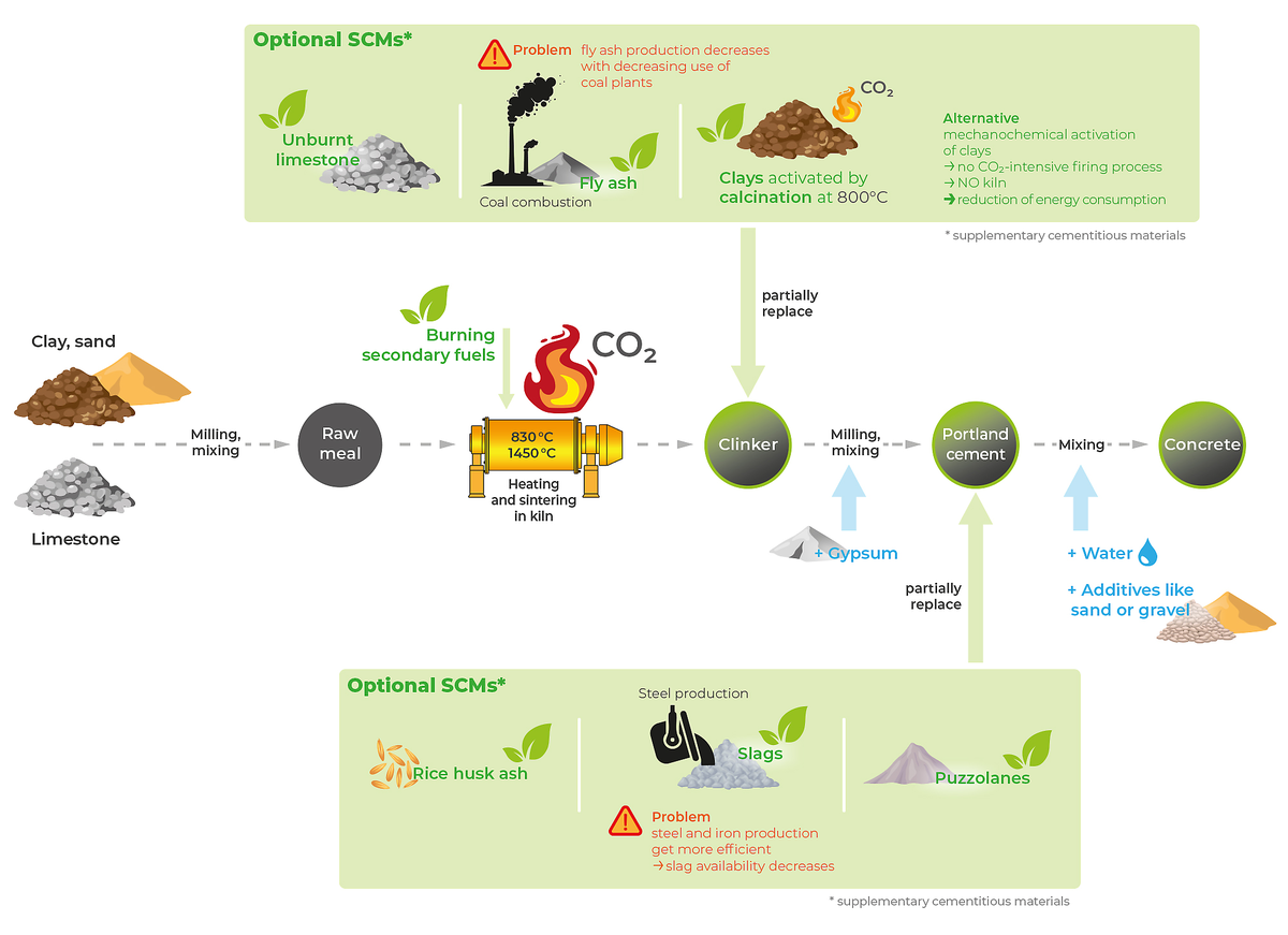 The highest energy demand in cement production arises from heating the raw meal in the kiln. Additional electrical energy is required for cement grinding, limestone crushing, and conveying processes. Around 50 % of total CO₂ emissions originate from the chemical calcination reaction in the rotary kiln, while the remaining emissions result from fuel combustion and electricity consumption. Even when renewable energy sources are used, these process related CO₂ emissions remain inherent to cement production.