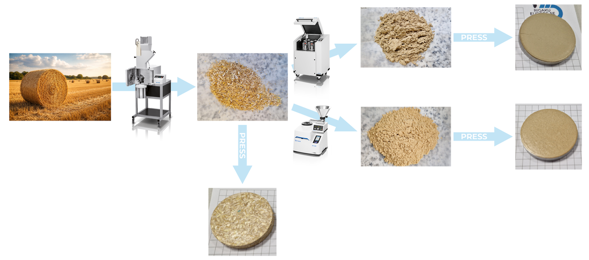 If the fiber content of the ground sample needs to be reduced, the sieves in cutting mills or the SR 300 can be installed in reverse orientation, or the rotor speed in rotor mills can be reduced. For XRF analysis, very fine grinding - often below 50 µm - is required; whether ball mills or rotor mills are more suitable depends on the downstream analysis, since ball mills provide finer results but take longer and may generate more metal abrasion [3]. If abrasion is not critical, the general rule for reproducible XRF results is: the finer, the better.