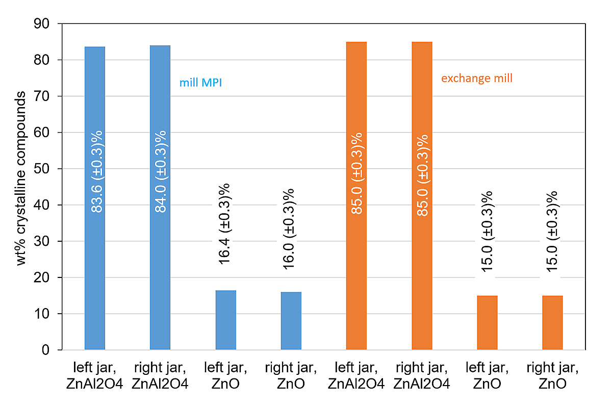 机械化学反应γ-Al2O3 + ZnO -> ZnAl2O4 使用 25 毫升研磨罐、2 x 15 毫米研磨球、1 克研磨剂,在 28 赫兹、29 赫兹和 30 赫兹频率下连续进行五次,每次 30 分钟。左右夹持台之间的比较和 5 次试验之间的比较均显示出结果的高度重现性。