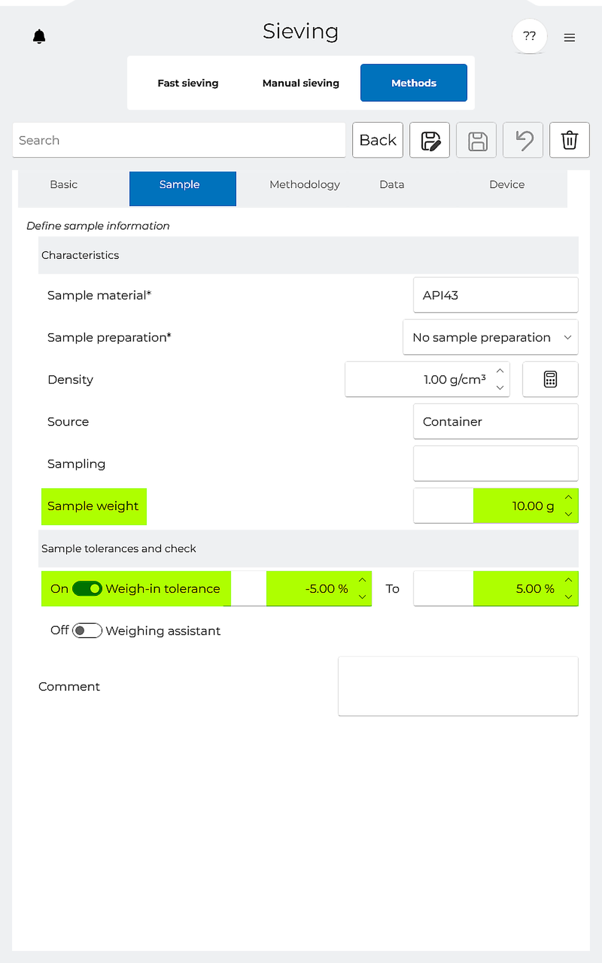 The “Weighing Assistant” exclusively can be used with RETSCH test sieves and can easily be activated/deactivated in the method.