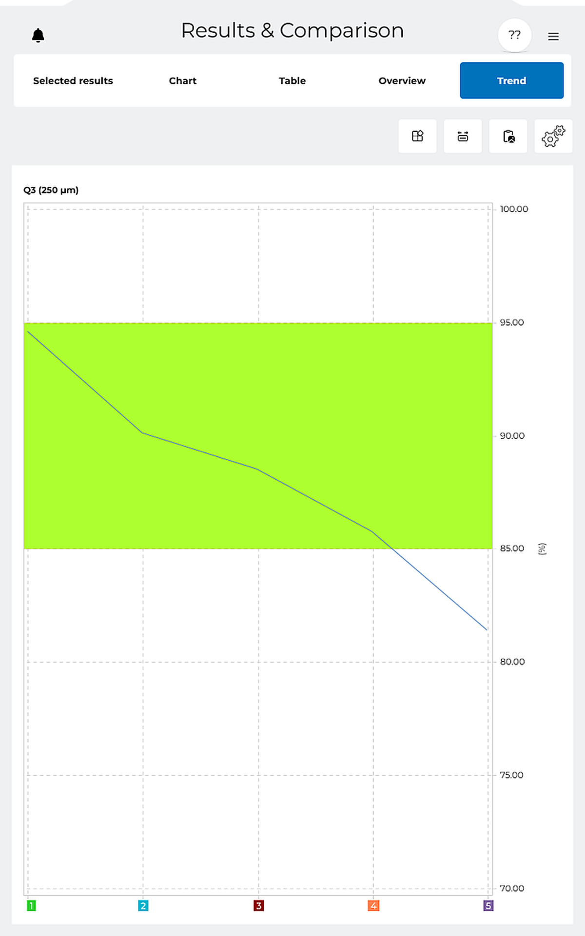 Trend analysis can be used to compare several sieving processes based on freely selectable parameters. This allows you to benefit from simple and reliable monitoring of various quality criteria.